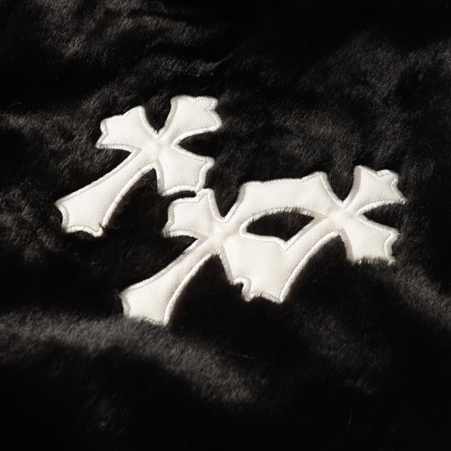 Chrome Hearts Faux Fur Cross Varsity Jacket - Black White Gothic Streetwear 035